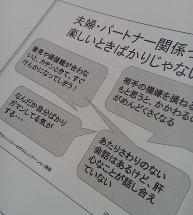 講座では、パートナーとの関係で不毛なエネルギーを使ってしまう「けんか」になってしまうとき、そのエネルギーをどうやって「建設的な対話」につなげていくのか、そのポイントを中心に学んでいただき、実際に「伝える演習」にも取り組んでいただきました。